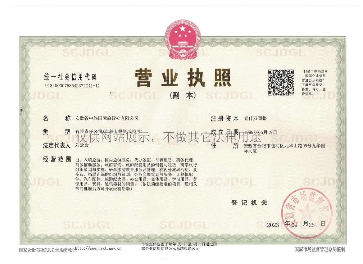 聯(lián)系地址:合肥市包河區徽州大道與九華山路交口西南側 信旺九華國際大廈22層,安徽省中旅國際旅行社有限公司;