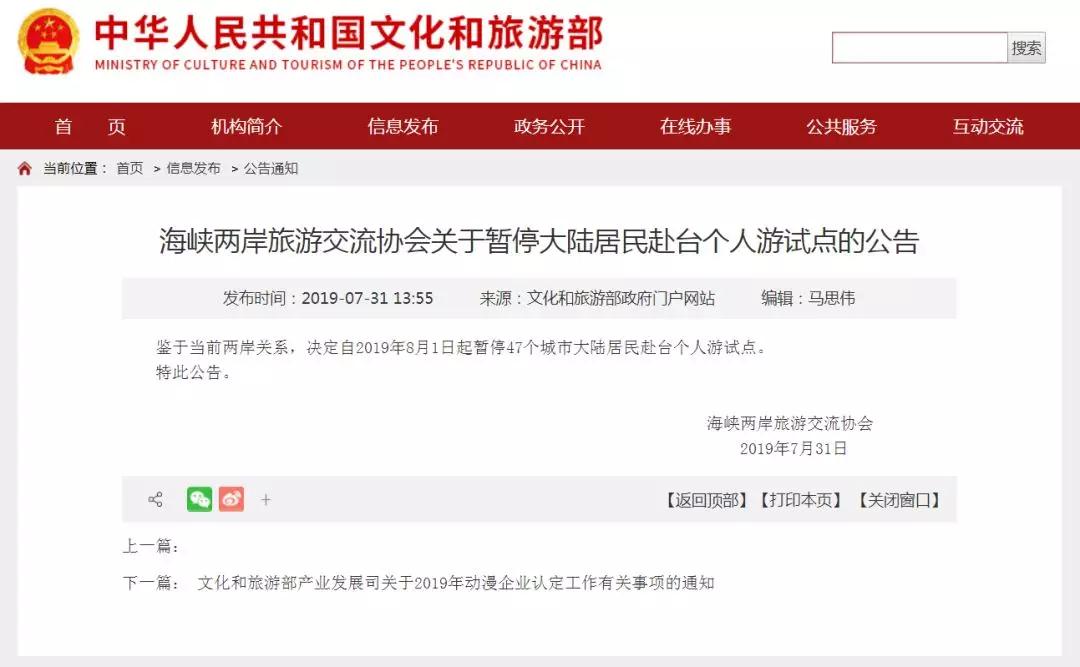 海峽兩岸旅游交流協(xié)會(huì )今日發(fā)布公告:鑒于當前兩岸關(guān)系,決定自2019年8月1日起暫停47個(gè)城市大陸居民赴臺個(gè)人游試點(diǎn)。